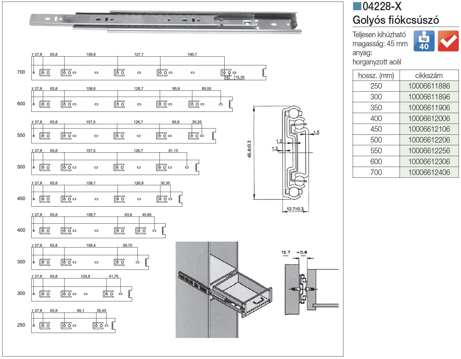 Telj. kihúz. fiókcsúszó 700 mm 45 kg